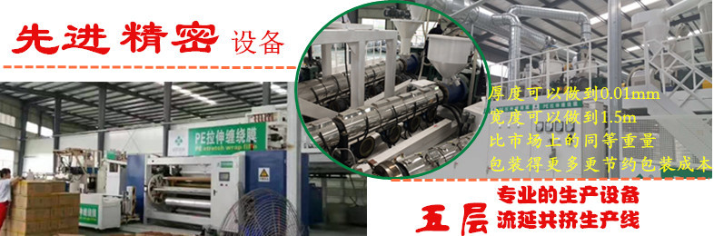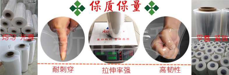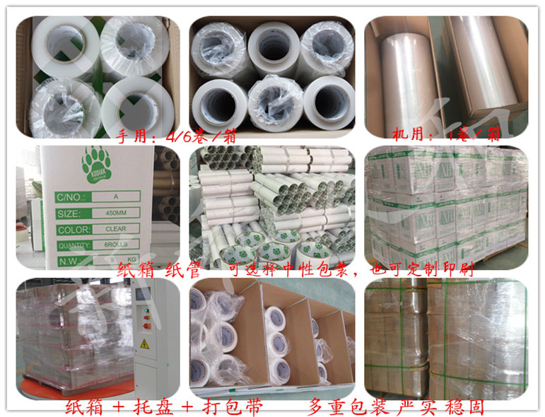5. 具有良好的回縮記憶及自粘性,能使貨物緊裹成一個整體,防止運輸時閃落倒塌及灰塵污染常用寬度有450mm、500mm、1000mm等 ,特殊寬度任意分切,厚度為0.015mm~0.025mm厚度根據(jù)客戶要求任意調制,拉伸膜,有手用和機用兩種